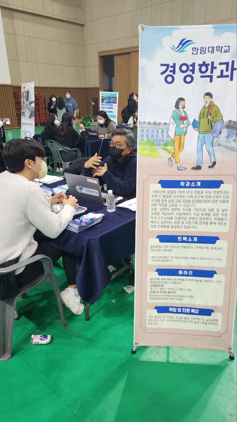 올해는 거리두기가 해제되며 대면 전공박람회가 개최되었습니다. 학과부스 뿐만 아니라, 타로카드 및 인생네컷 등 다양한 체험활동이 있어 학생들의 참여율이 높았습니다. 경영학과 부스에도 많은 학생들이 참여해주었습니다. 경영학과 학생들이 방문하여 그동안 학사 행정에 대해 궁금했거나 헷갈렸던 점을 물어보기도 하고, 진로와 관련하여 고민 점을 교수님과 상담을 하기도 했습니다. 복수전공을 경영학과로 고민하고 있는 학생들도 많이 방문하여 학과의 주 진로나, 트랙제도 등에 대하여 설명을 들었습니다.
