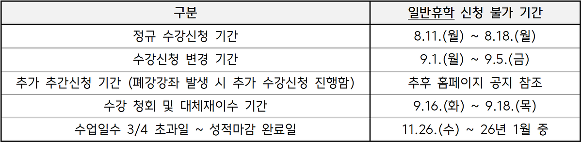 - 일반·창업·임신·출산·육아휴학 접수기간: ~ 2025.11.25.(화)까지 (수업일수 ¾ 이내)