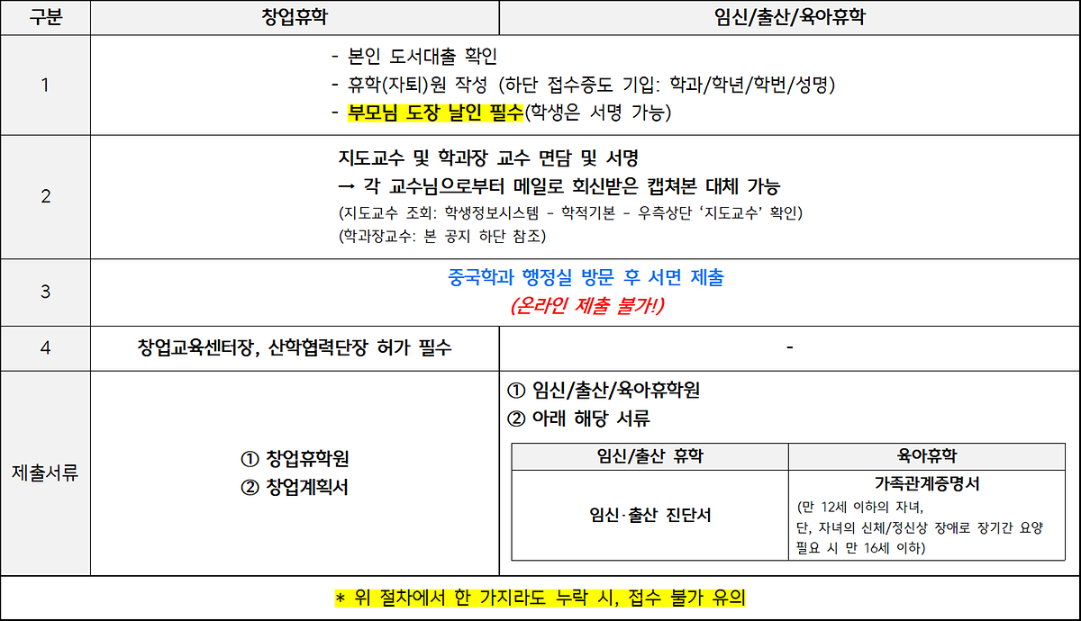 ※ 휴학원 제출방식 : 온라인 제출 불가, 반드시 행정실 방문 제출!