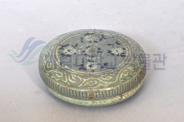 이 청자 합은 납작한 원형으로 손바닥 보다 작은 크기입니다. 합은 뚜껑과 몸체가 하나의 세트를 이루는 기종으로, 화장품이나 약, 음식을 담아 보관하는 용도로 쓰였습니다. 이 청자 합의 중앙에 국화 꽃송이와 줄기를 배치하고, 그 주변에는 당초문(줄기, 덩굴, 잎이 연속적으로 이어진 식물무늬, 길상(吉祥;좋은 일이 있을 조짐)의 의미를 가짐)을 둘렀습니다. 대부분의 무늬를 백색 상감기법으로 표현하였으며, 국화의 꽃술과 줄기는 흑색의 상감기법으로 표현하였습니다.