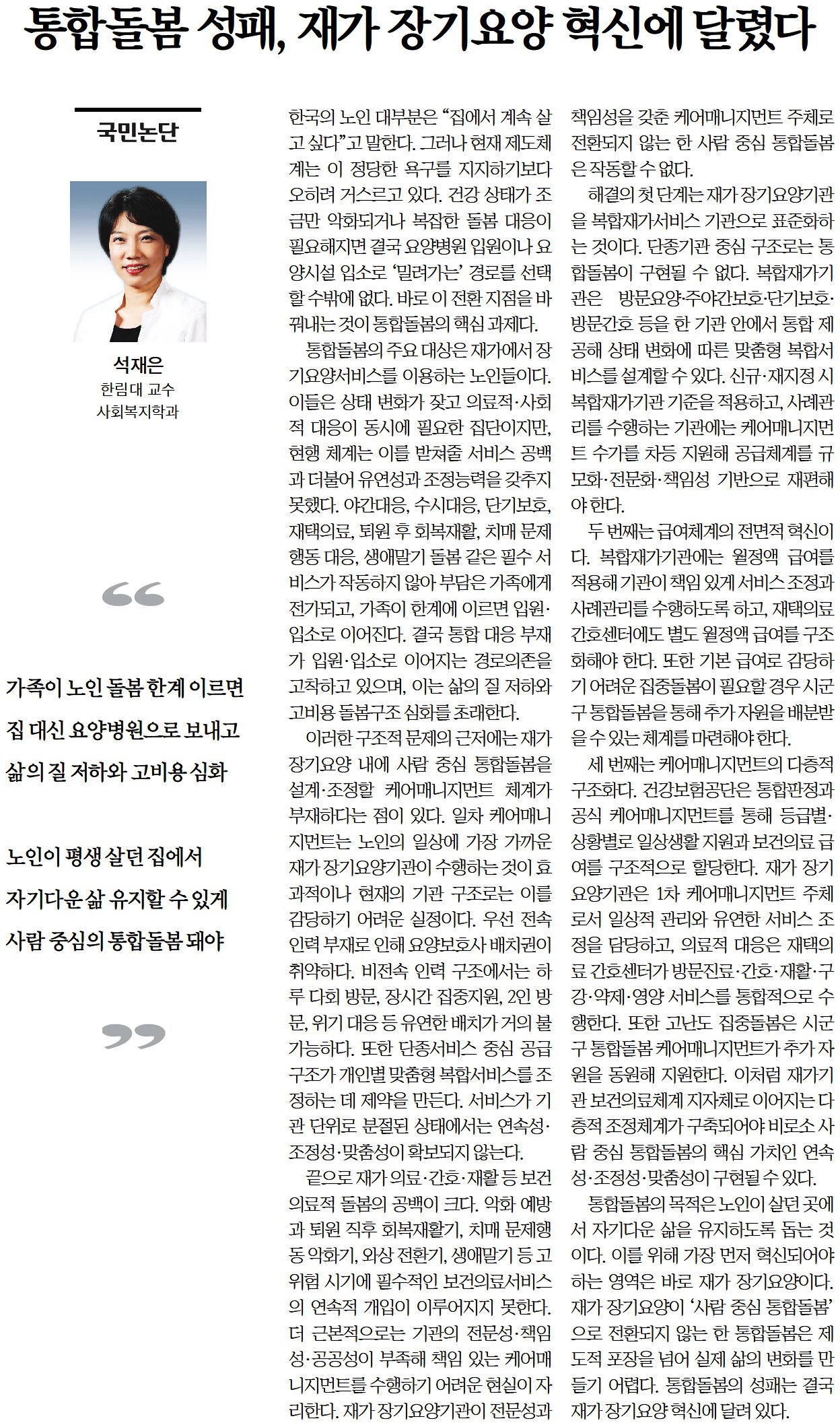 -석재은(사회복지학부) 교수, 칼럼
