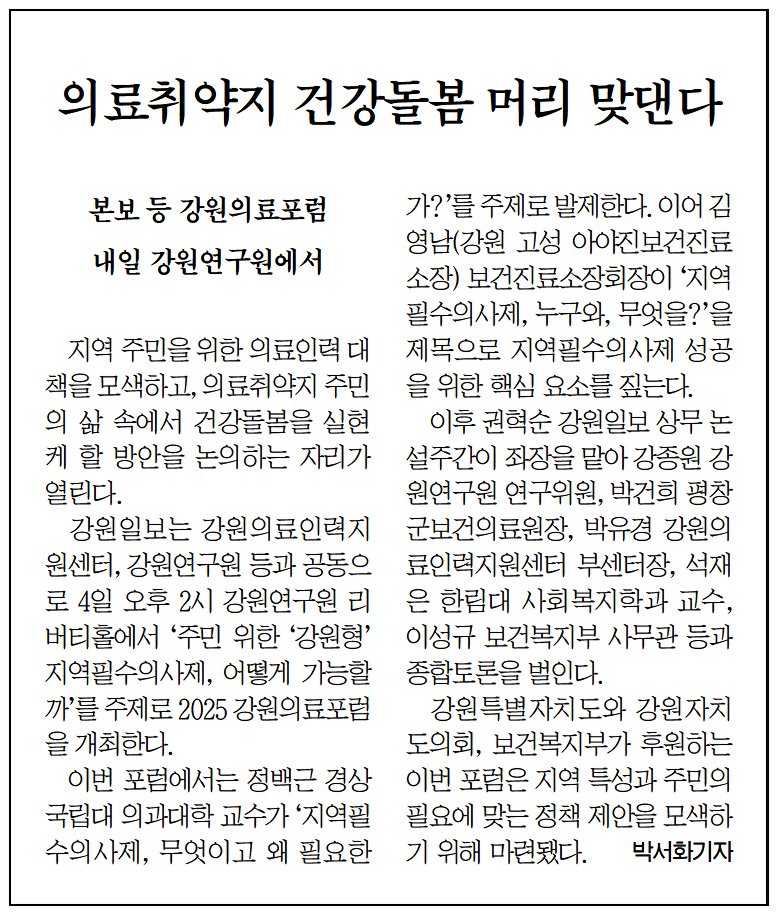 석재은(사회복지학과) 교수, 오는 4일(목) '2025 강원의료포럼' 토론회 참석